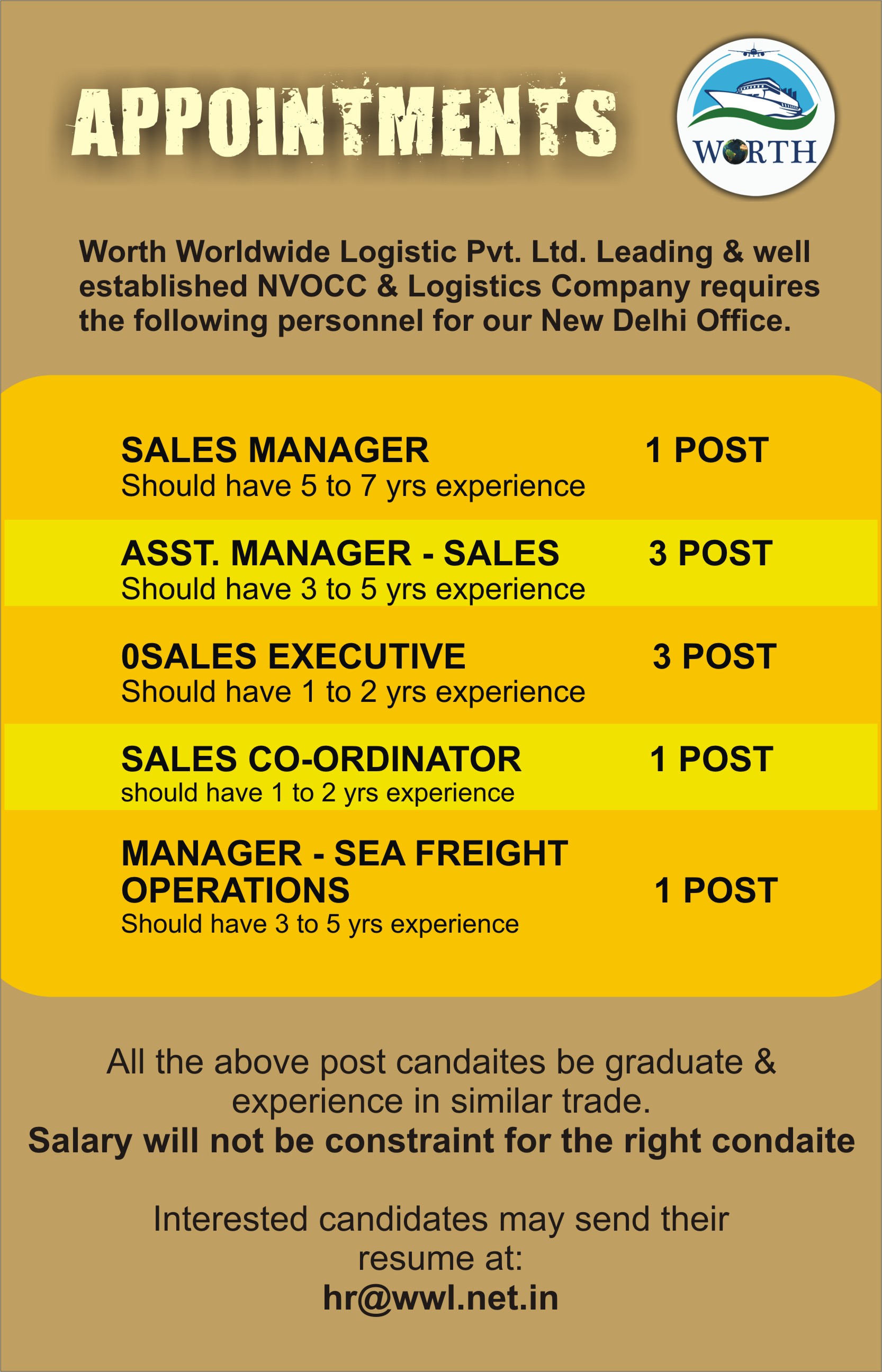 We offer multiple opportunities to our people to develop skills they are good at. Our teams consist of highly professional individuals who ensure seamless and error free service to our valued Customer. All the employees and staff undergo periodical skill set training and have access to systems that enable them to stay updated with the latest in their area of expertise. While hard work and innovation is promoted, we also nurture their personal objectives. We ensure that our employees get enough opportunities to learn, grow, and succeed. If you want to join our team, Please Email your Resume to hr@wwl.net.in
